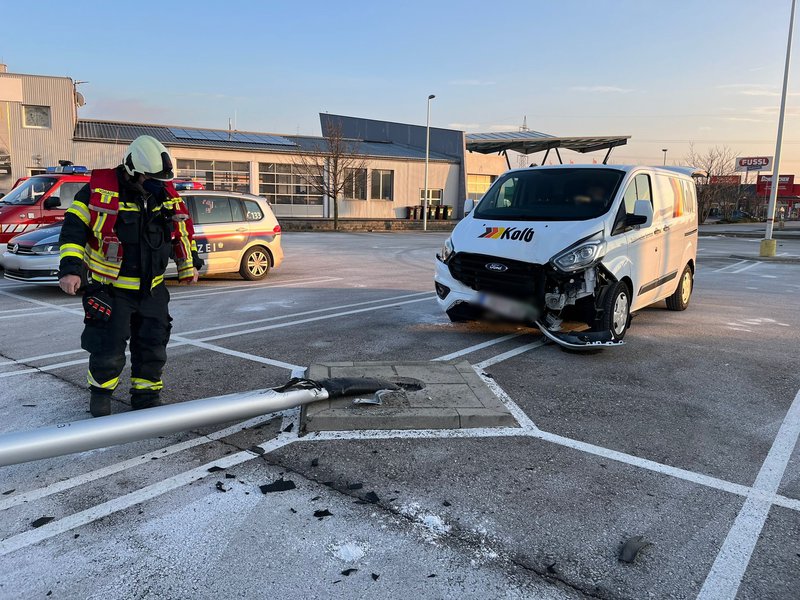Ein Kleintransporter war aus uns unbekannten Gründen gegen einen Laternenmasten gefahren, woraufhin dieser umknickte und umfiel. Das Fahrzeug wurde ebenfalls beschädigt.