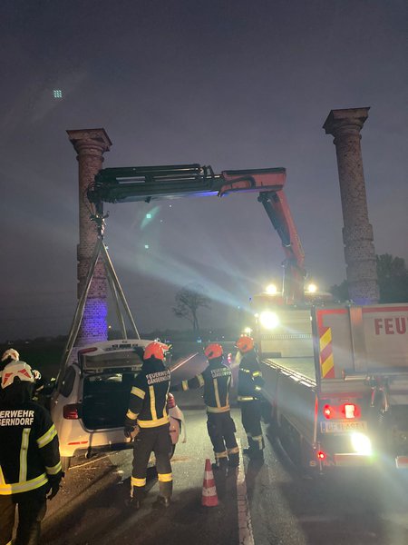 Heute Morgen wurden wir zu einer Fahrzeugbergung zwischen Gänserndorf und Schönkirchen-Reyersdorf gerufen. Ein PKW war aus uns unbekannten Gründen von der Fahrbahn abgekommen, gegen eine der berühmten Säulen geprallt und ist danach fahruntüchtig auf der Fahrbahn zum Stillstand gekommen. Bei unserem Eintreffen war die Polizei bereits vor Ort und übernahm Verkehrsregelung. Das verunfallte Fahrzeug wurde während einer kurzen Komplettsperre der Bundesstraße mittels Kran auf unseren Lastkraftwagen gehoben und dann verkehrssicher abgestellt. Nachdem dann noch die Fahrbahn von diversen Fahrzeugteilen gesäubert wurde, konnte diese schließlich wieder für den Verkehr freigegeben werden.