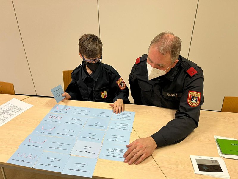 Auch die vierte Jugendstunde stand ganz im Zeichen der Vorbereitungen für den Wissenstest. In Kleingruppen wurden wieder wichtige praktische Themen wie Knotenkunde, die Bedienung der Handfunktgeräte oder die Bestandteile der persönlichen Schutzausrüstung geübt. Aber auch theoretisch müssen die Jugendlichen Einiges können. So werden Dienstgrade oder theoretische Fragen im Zuge des Wissentestspieles abgefragt.