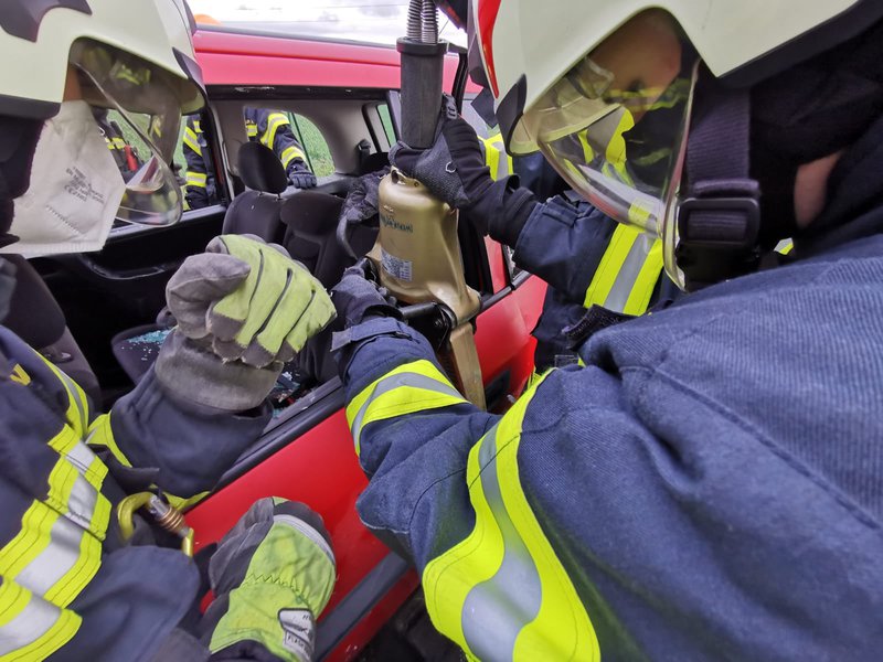 Dieses Mal wurden mit dem hydraulischen Rettungssatz die unterschiedlichen Schneidetechniken geübt, die bei Personenrettung nach Verkehrsunfällen zur Anwendung kommen können. Ebenfalls wurde die Anbringung von Schutzeinrichtungen wie dem Airbag-Sicherungssystem demonstriert und die Handhabe gefestigt.